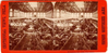 the photo is on red cardboard and it is the inside of a hall filked with vegetation.