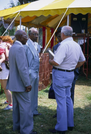 Members of Shape Note Singers (from Oklahoma) speaking with a guest (outdoors). ; 1982