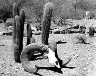 Desert Bighorn Sheep skull with horns, believed an Arizon Record head, outside measurement 39 inches. Organ Pipe Cactus National Monument.