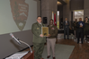 A man in a dark brown military uniform suit on the right and a man in a green ranger suit on the left stand next to one another while both hold onto a brass-colored plaque with an image on the bottom of a man on a horse and the outline of an arrowhead around him.