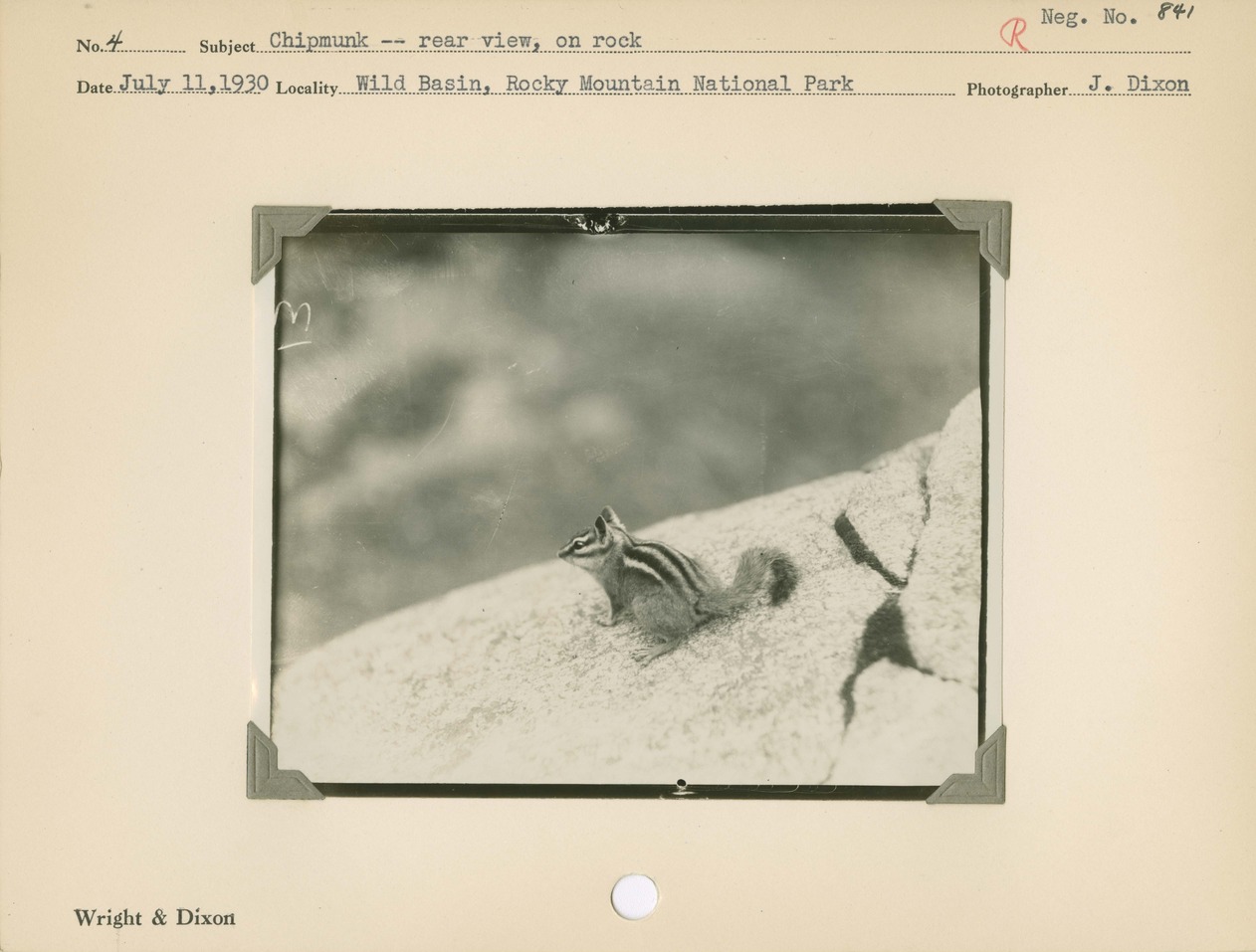 Chipmunkārear view, on rock. Locality: Wild Basin, Rocky Mountain National Park. Negative #: 841.