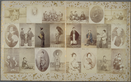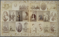 Two pages from album with 22 images pasted in, mostly studio portraits of young women in Japanese clothing. Two portraits hand-tinted. Inscriptions identifying sitters on the top edge of individual photographs.