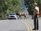 Park ranger stopping traffic while bull elk crosses road in Mammoth Hot Springs;