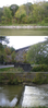 Photographs of water-control features. Three photographs show the following (1) large boulders used as rip rap along a shoreline, (2) a lock beneath an arched bridge, and (3) a short dam spanning a river with water spilling over the top.