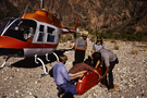 NPS employees putting a litter together in front of a helicopter in Grand Canyon National Park.