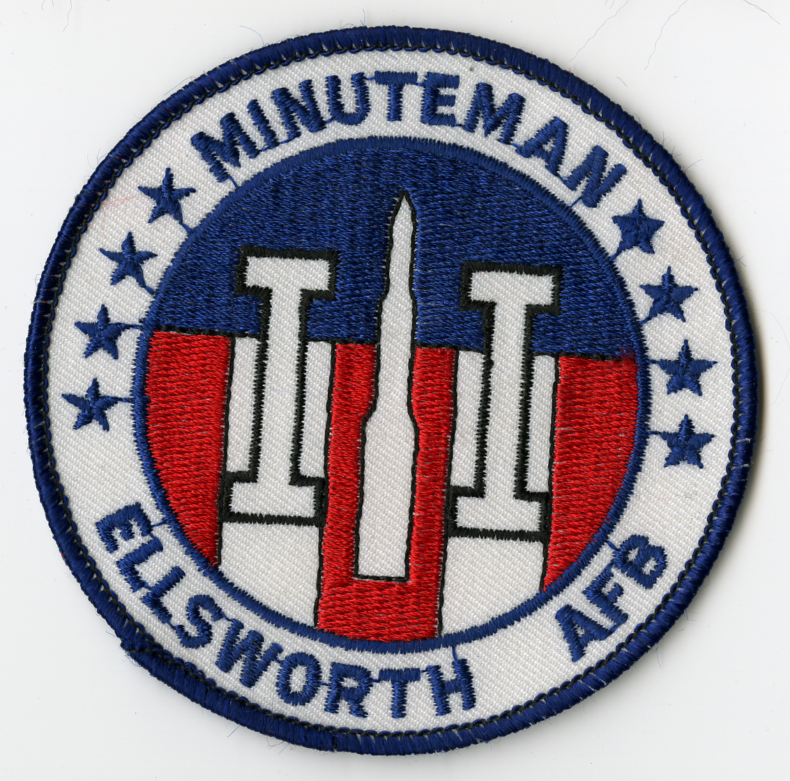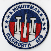 White circular with dark blue trim. Arched around outside of circle on top in black are four stars then MINUTEMAN" and four stars beneath wording. Arched around outer of circle on bottom is "ELLSWORTH AFB." In center is smaller circle trimmed in black. Upper part of circle is black. Lower part of circle is divided into five equal vertical stripes trimmed in black. Stripes alternate from red to white starting with red. In center of circle is white missile figure trimmed in black with nose pointed up. On each side of missile is roman number one in white with black trim."