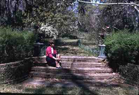 Four brick steps with matching urns on both sides of the top step. Steps lead to path surrounded by shrubs and flowers. A lady is sitting on the steps.