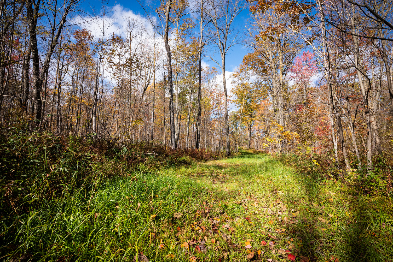 Photograph of a forest scene in autumn with trees covered in colorful foliage and fallen leaves scattered across a trail leading into the forest.
