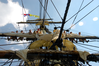 National Park Service volunteers demonstrate how to furl a sail on board the replica tall ship Friendship
