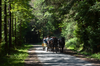 Wagon riders on a tree-lined path