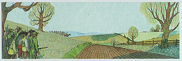 Militia and minutemen standing in foreground with a muskets. In background, Captain Isaac Davis, the Acton gunsmith, arrives with the minutemen from his town.