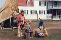 A man and two boys in traditional American Indian dress in front of a buffalo hide tipi
