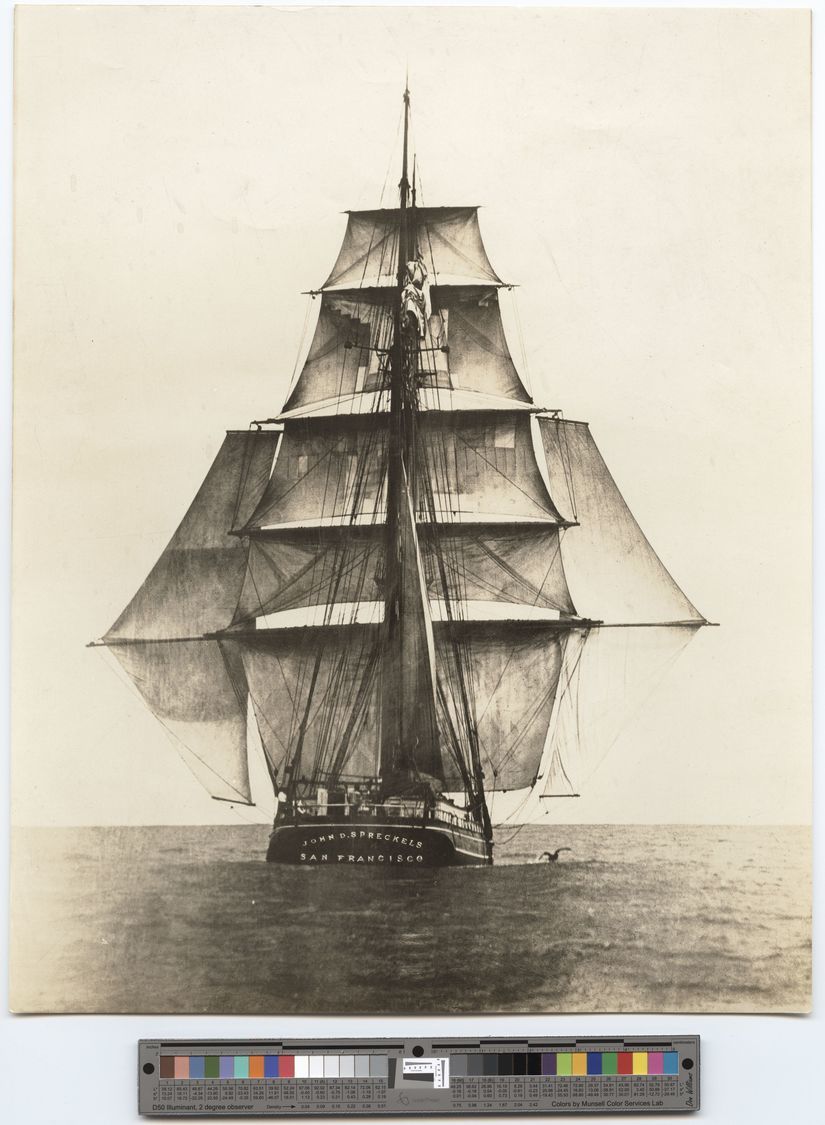 John D. Spreckels (built 1880, brigantine) in open waters with studding sails set, circa 1880-1908
