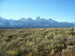 Teton Range from Blacktail Butte with sagebrush and new snow in mountains.