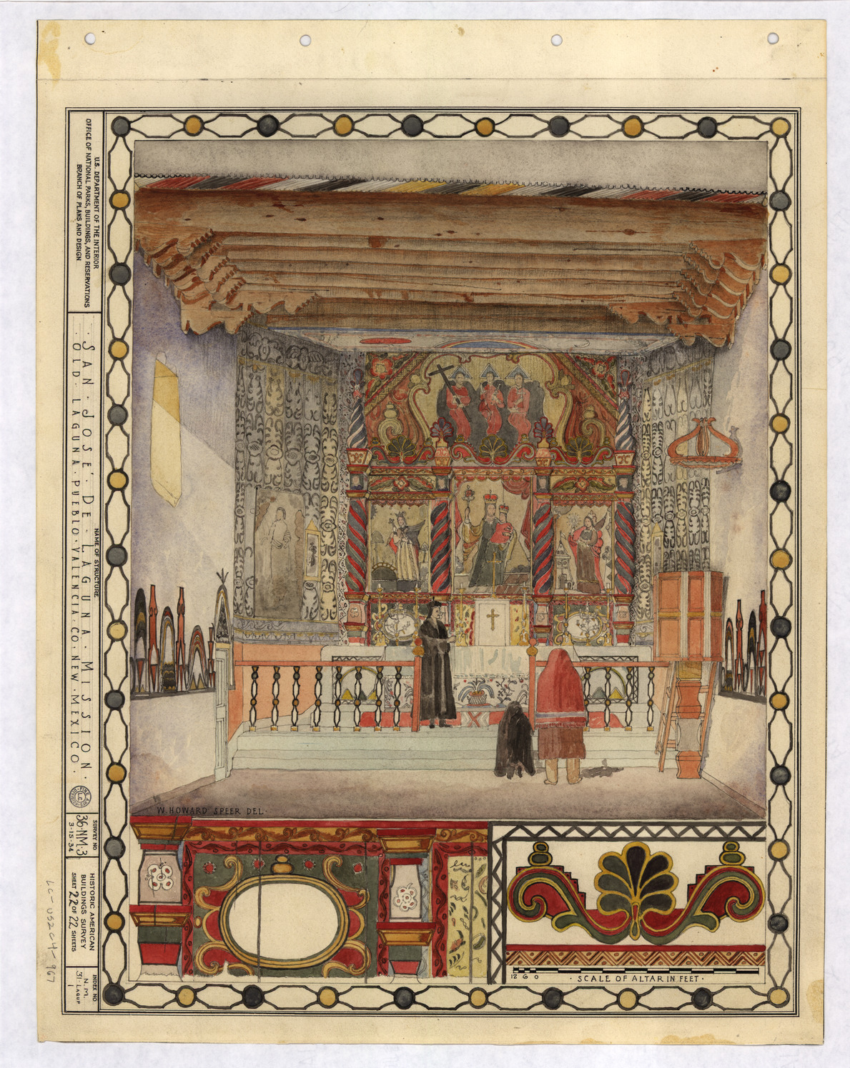 Watercolor depicting priest and two women in front of painted altar