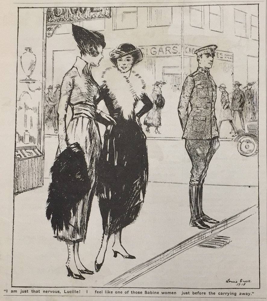 Photo of an illustration showing a street corner. Two well dressed women talk to each other; behind them is a handsome man in an Army uniform. The full caption reads "I'm just that nervous, Lucille! I feel like one of those Sabine women just before the carrying away."