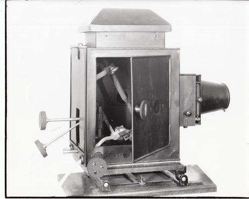 Edison projecting kinetoscope, exhibition model, detail of lamp housing, door open.