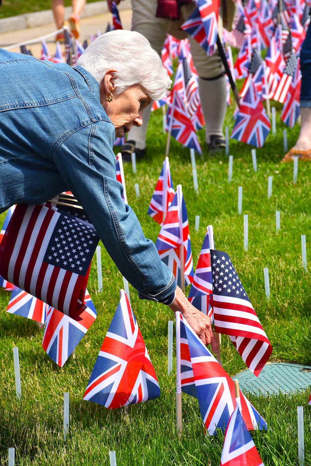 An older woman puts a US flag in a flag holder in the ground.