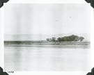 This is an historic black and white photograph from the Scotty's Castle Historic Photograph Collection, Death Valley National Park of rural scene. Flat dirt area in foreground. Mid-ground is line of low brush along a field. Grown trees line back of field. Faint mountains in background. Number in black ink in lower left corner.