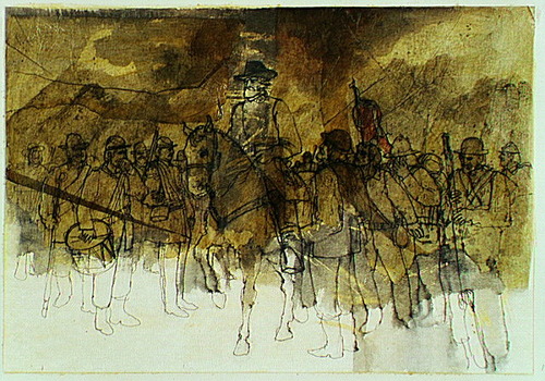 Confederate General Robert E. Lee riding between rows of his troops.