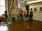 The photograph shows the subcontractor bringing the mockup window sash in through the existing opening.