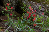 A dozen or so narrow-petaled bright red flowers scattered with green stems and leaves.