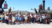 Visitors gathers to recreate the Historical Champagne photo in front of two historical replicas of the locomotives.