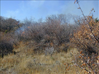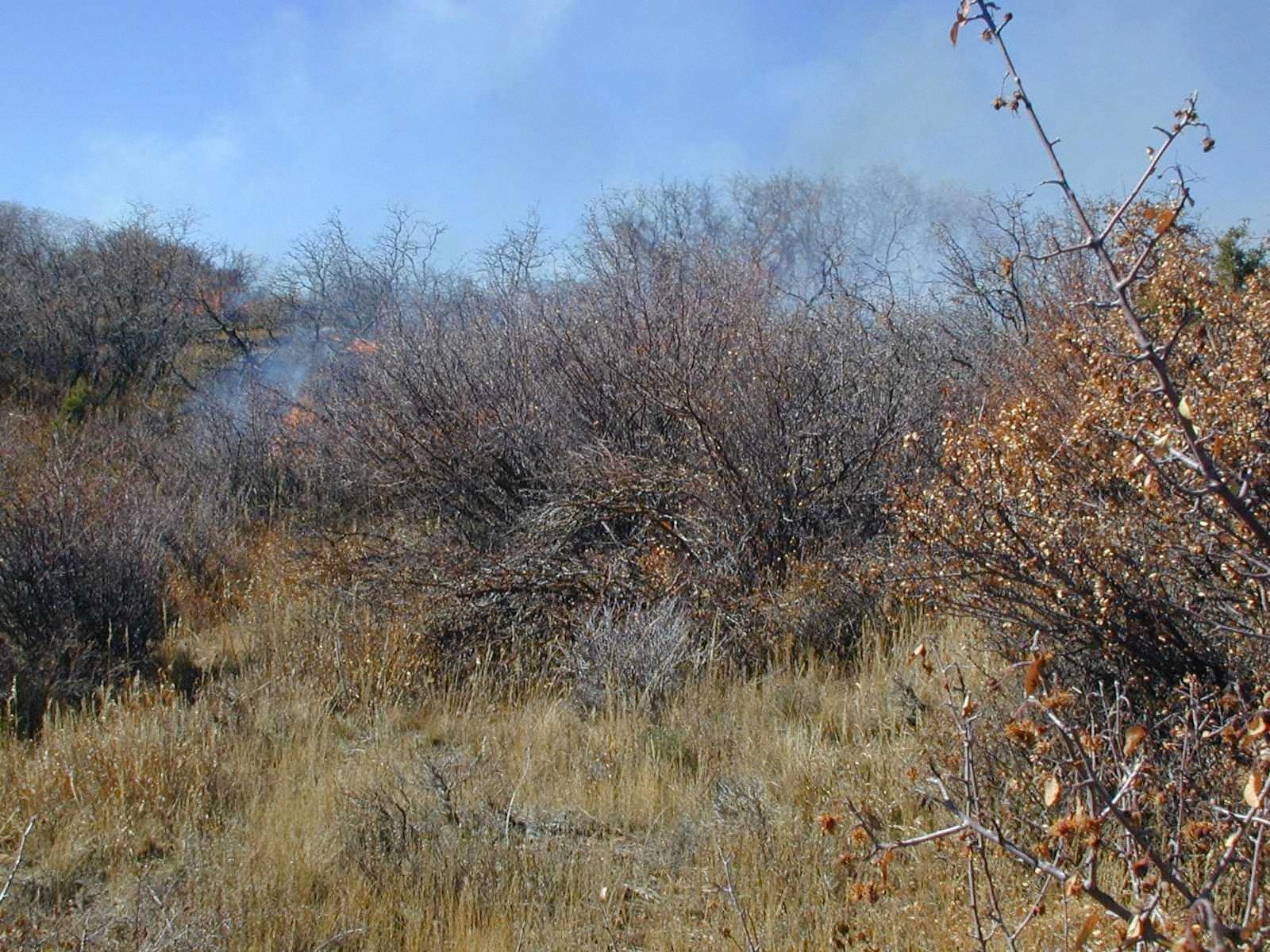 High intensity flames in dense brush during Far View prescribed fire, November 2001. In Burn Unit 2, fire behavior was moderate to intense throughout the entire burning period. Mostly backing fires were witnessed, except when wind gusts produced heading fires. Spread rates were mostly 2-10 chains/hour with flame lengths of 3-18" in grass and 2-10' in brush, and reached 60 chains/hr with flame lengths of 2-3' in grass and 10-20' during the strongest wind gusts. Flame lengths of 50-80' were observed during the occasional torching of pinyon and juniper trees. Solid ground fuels were mostly consumed. In Burn Unit 1, lighter fuels resulted in lower burn intensities. Spread rates of 2-10 chains/hr were observed in grass, and reached 5-15 chains/hr in shrub clumps. Runs were short-lived and patchy due to sparse fuels over much of the burn unit and increasing relative humidities later in the day.