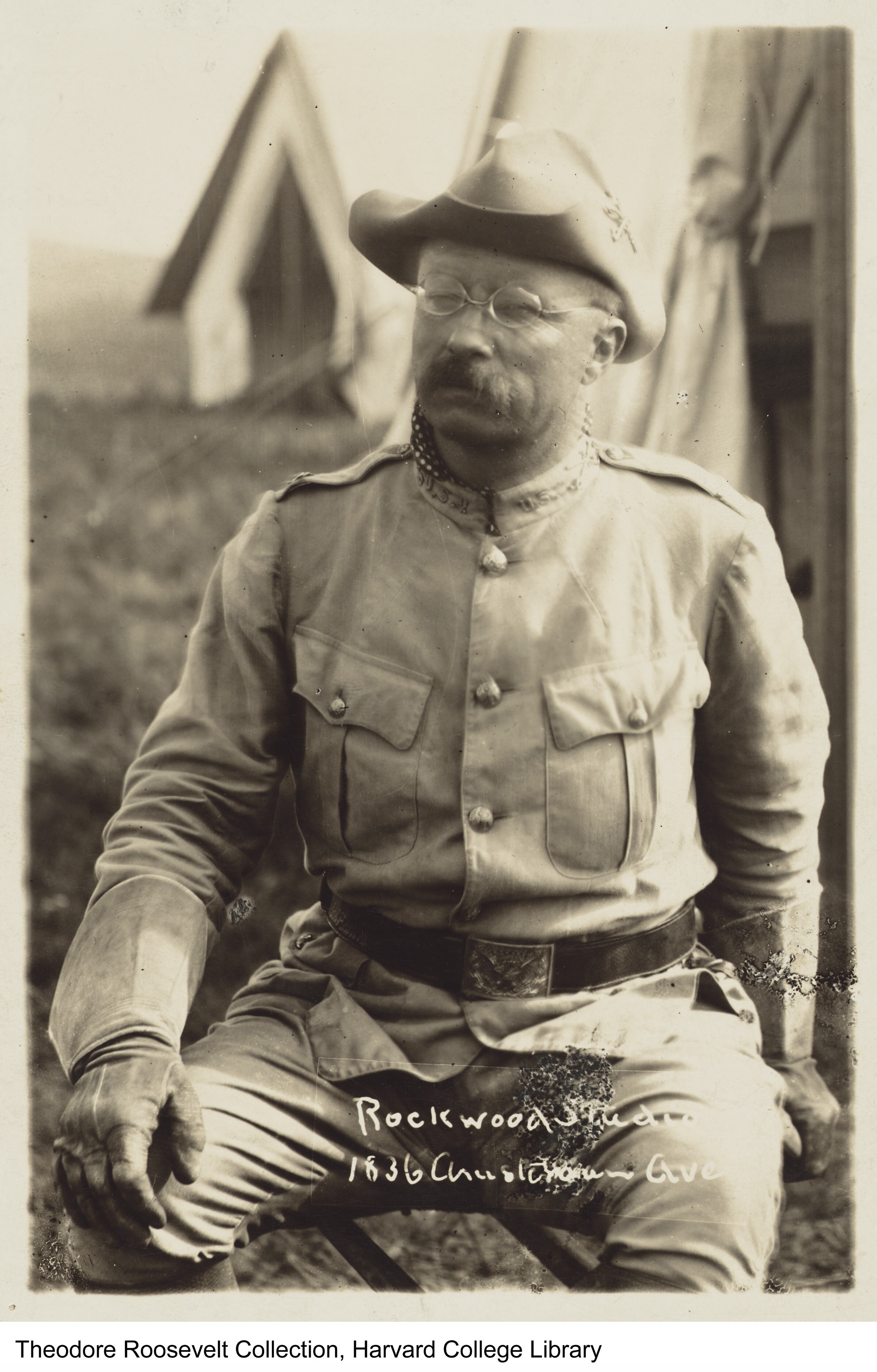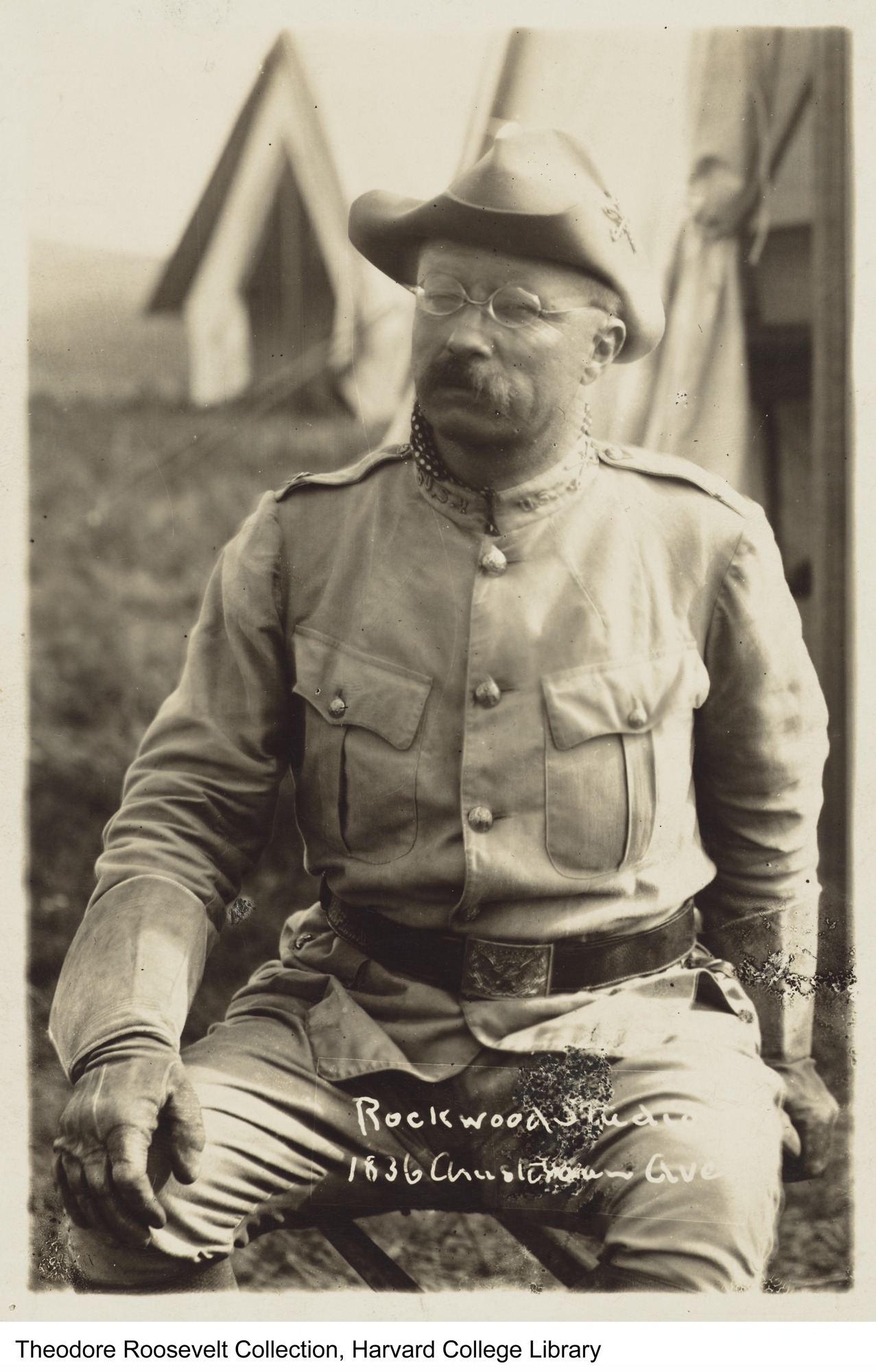 Sepia photograph of TR sitting on a stool, in full U.S.V. Uniform, looking directly at camera. His right hand is perched on his right knee, and his left hand is set back, resting on stool. in background stands two camp tents.