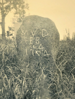 This simple grave marker records the burial location of Matthew Valentine (MV), who died ((D) on Feb 14, 1704. Town population was perhaps 250, when almost everybody knew each other, and hence initials were sufficient to identify the deceased. Carvers also had limited skills and tools, and the smaller the inscription the better. His death on Valentine's Day is a interesting coincidence. Photo was taken, with chalk on the inscription, in the 1930s.