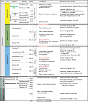 division are in parentheses. Compass directions in parentheses indicate the regional locations of events. Boundary ages