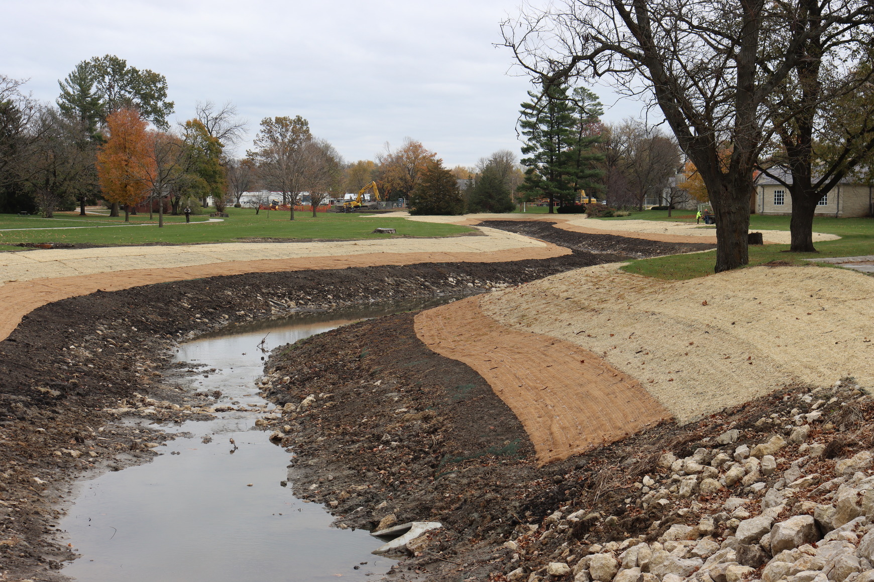 Creek enters from bottom center of image and runs into the distance in the center. Gentle slopes run down to the water on each side and are protected by three layers of coverings. A stand of trees is to the left filling out the park-like setting.