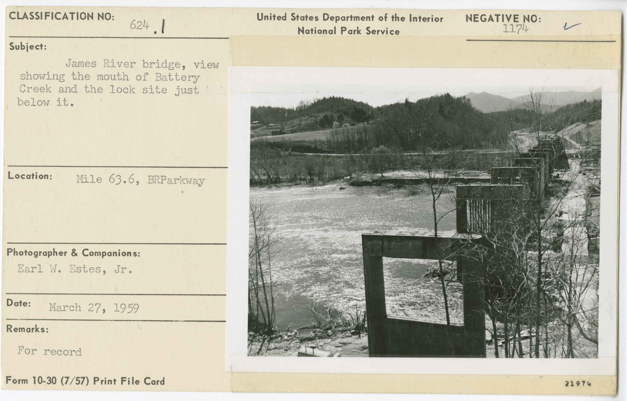 View showing the mouth of Battery Creek and the lock site just below it. Milepost 63.6, Blue Ridge Parkway