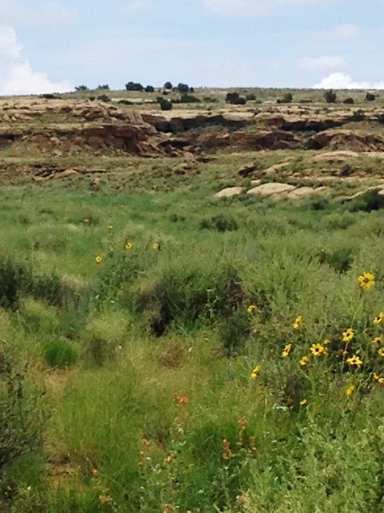 Tall, yellow sunflowers growing in a field of grass and shrubs spotted by Jody Mays in June of 2015.