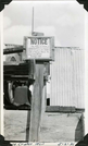 Sign mounted at Gold Crater Well that reads: NOTICE This well and Ranch is owned by DEATH VALLEY SCOTTY and A. M. Johnson of Chicago, Illinois. No trespassing allowed. May 2, 1931. Sign on front of wood platform that holds pumping equipment. Inscription in black ink on obverse lower edge: Gold Crater Well 5-2-31. Black and white, vertical format. All the wells and springs in this series of photographs are near the Kawich Range in Nevada that Johnson purchased for horse range and water rights.