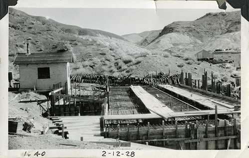Scotty's Castle Hacienda, looking east. First floor flat room rebar in place before concrete poured. Fire Cache on left. February 12, 1928. Photographed by Mat Roy Thompson.
