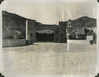 Scotty's Castle Entrance Gate with a signs posted on each side: The Castle Is Closed Positively No Admittance Scotty. Circa 1931. Photographed by Mat Roy Thompson. Gates are closed. Sign near gate says: The Castle Is Closed Positively No Admittance Scotty. View of Power House and Pavilion and Chimes Tower in background. Some adhesive damage, emulsion crack bottom center. Reverse not examined. Black and white, 8 x 10 inch, horizontal format. Corner mounted and glued in photograph album.