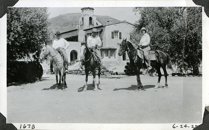 Albert M. Johnson, Matt Roy Thompson, and Edna Devlin on horses in front of Scotty's Castle Main House. June 24, 1928. Photograph probably staged by Mat Roy Thompson. Trees and clay pipe visible behind riders. Devlin is Albert M. Johnson's secretary. Inscription in black ink on lower left corner referring to historic photograph number system: 1678; date in lower right corner: 6-24-28. Inscription in pencil on reverse: 116. Black and white, 3x5 inch, horizontal format. Corner mounted and glued in photograph album.