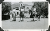 Albert Johnson, Matt Roy Thompson, and Edna Devlin on horses in front of Scotty's Castle Main House. June 24, 1928. Photograph probably staged by Mat Roy Thompson.
