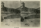 Scotty's Castle Power House and Pavilion. Curved southwest corner under construction. April 20, 1930. Photographed by Mat Roy Thompson. Scaffolding, ladders, construction debris and excavation in foreground. Chimes Tower in background. Inscription in black ink, lower right corner of left print: 4-20-30. Black and white stereograph, vertical format.