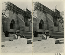 Scotty's Castle Power House and Pavilion under construction, looking west. Three lengths of pipe, probably the cast iron drain for the power-producing Pelton water wheel. February 9, 1930. Photographed by Mat Roy Thompson. Forms and hollow tile on top of wall. Inscription in black ink, lower right corner: 2-9-30. Black and white stereograph, vertical format.