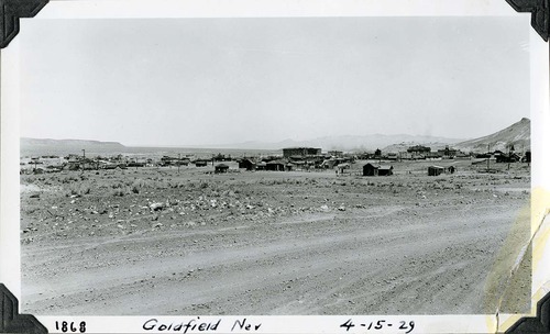 Distant view of Goldfield, Nevada. April 15, 1929. Photographed by Mat Roy Thompson. Large building in center, other commercial buildings, several small residences, dirt city streets, numerous power poles. Dirt road in foreground. of town, perhaps hotel. Photographed by Mat Roy Thompson. Inscription in black ink, lower center margin: Goldfield Nev. In black ink, lower right: 4-15-29. Number in black ink in lower left corner refers to historic photograph numbering system: 1868. Black and white, horizontal format, 3 x 5 inch. Corner mounted on photograph album page.