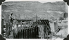 Man working on Scotty’s Castle Entrance Gate east wing wall construction. April 10, 1931. Photographed by Mat Roy Thompson. Concrete Entrance Gate Dungeon Apartment in center with other bridge abutment behind. Another laborer moving across bridge deck. Several men working in background with shovels. End of Gravel Separator visible on left (west) edge. Black and white, horizontal format.
