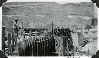 This is an historic black and white photograph from the Scotty's Castle Historic Photograph Collection, Death Valley National Park of simple concrete structure under construction. Two simple square structures complete. Elaborate wood forms in foreground for curved wall and decking between structures. Man working on forms in foreground. Another pushing concrete wheelbarrow over decking. At least four men in background shoveling sand pile. Large desert hillside in background.