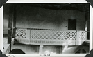 This is an historic black and white photograph from the Scotty's Castle Historic Photograph Collection, Death Valley National Park of Scotty's Castle Main House Gallery. Looking west at decorative railing above Great Hall. January 14, 1928. Photographed by Mat Roy Thompson.