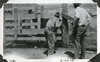 Albert M. Johnson on right watches as probably a horse is branded, at chute south of Scotty's Castle Stables. June 25, 1928. Photographed by Mat Roy Thompson.