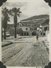 Mat Roy Thompson standing on road in front of Scotty's Castle Main House and Annex near the Hacienda gate. February 1, 1931. Presumable photograph set up by Mat Roy Thompson.
