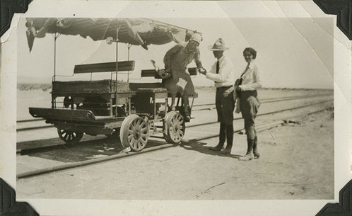 Helen Brown, Albert M. Johnson, and Edna Devlin, exiting open-air railroad car at unknown location. Circa 1930. Inscription in pencil, on reverse: 1. Black and white, 2 x 4 inch, horizontal format. Corner mounted in photograph album.