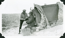 Two unidentified men in front of large metal box with grated front, set on wood planks. Probably being used for sleeping in. Circa 1922. Men dressed for colder weather. Corners of a tarp held in place on top of box with large rocks. Wooden tub and metal pail in foreground. Listed in earlier catalog record Other Numbers Field: 18. Stamped on reverse: Glossette A27. Black and white, 3 x 5 inch, horizontal format. Corner mounted on photograph album page.