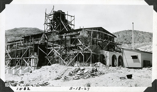 Scotty's Castle Main House, looking northwest. Additional scaffold on Observation Tower. Additional hollow tiles on Johnson's Sitting Room south and east walls. May 18, 1927. Photographed by Mat Roy Thompson. Inscription in black ink, bottom center: 5-18-27. Number in black ink at bottom left refers to historic photograph numbering system: 1582. In pencil, on reverse: 41. Black and white, horizontal format, 3 x 5 inch. Corner mounted in photograph album.